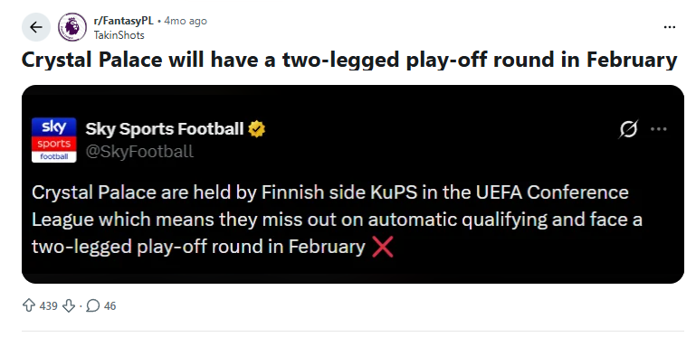 Lineups for Crystal Palace vs Fiorentina