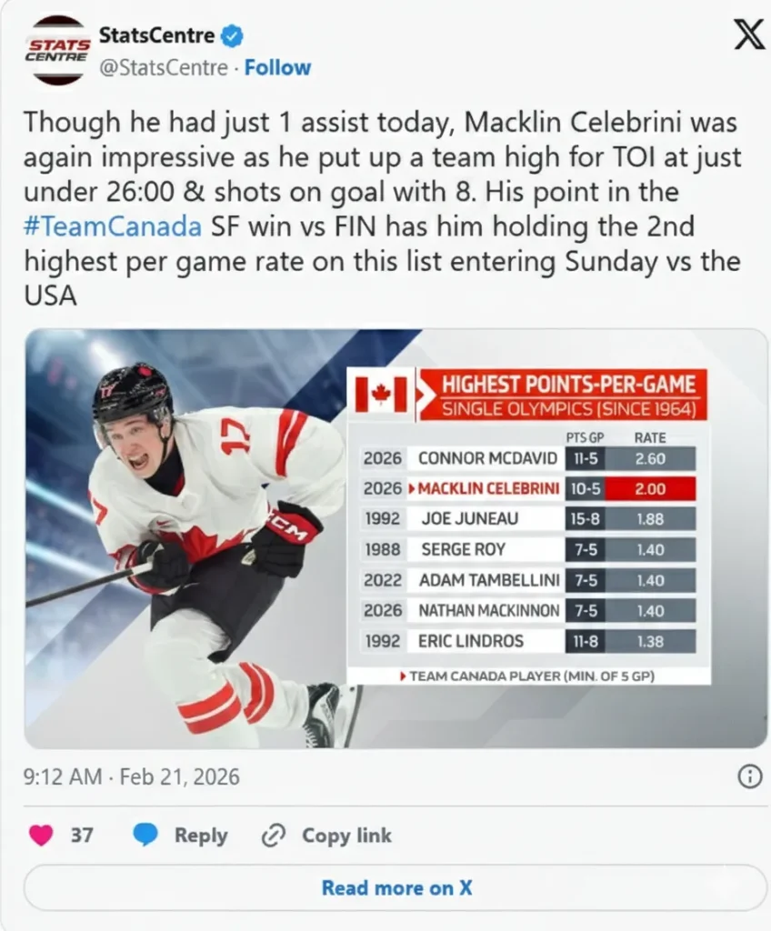 Canada’s firepower is real. Connor McDavid leads the tournament in points with 13 in five games. The Canadian unit has scored more goals on average than the U.S., and its power play sits near 44% efficiency. Meanwhile, the U.S. goaltender Connor Hellebuyck leads all Olympic goalies with a .947 save percentage and a 1.23 goals-against average. U.S. special teams also shine, with a perfect penalty kill through the tournament.